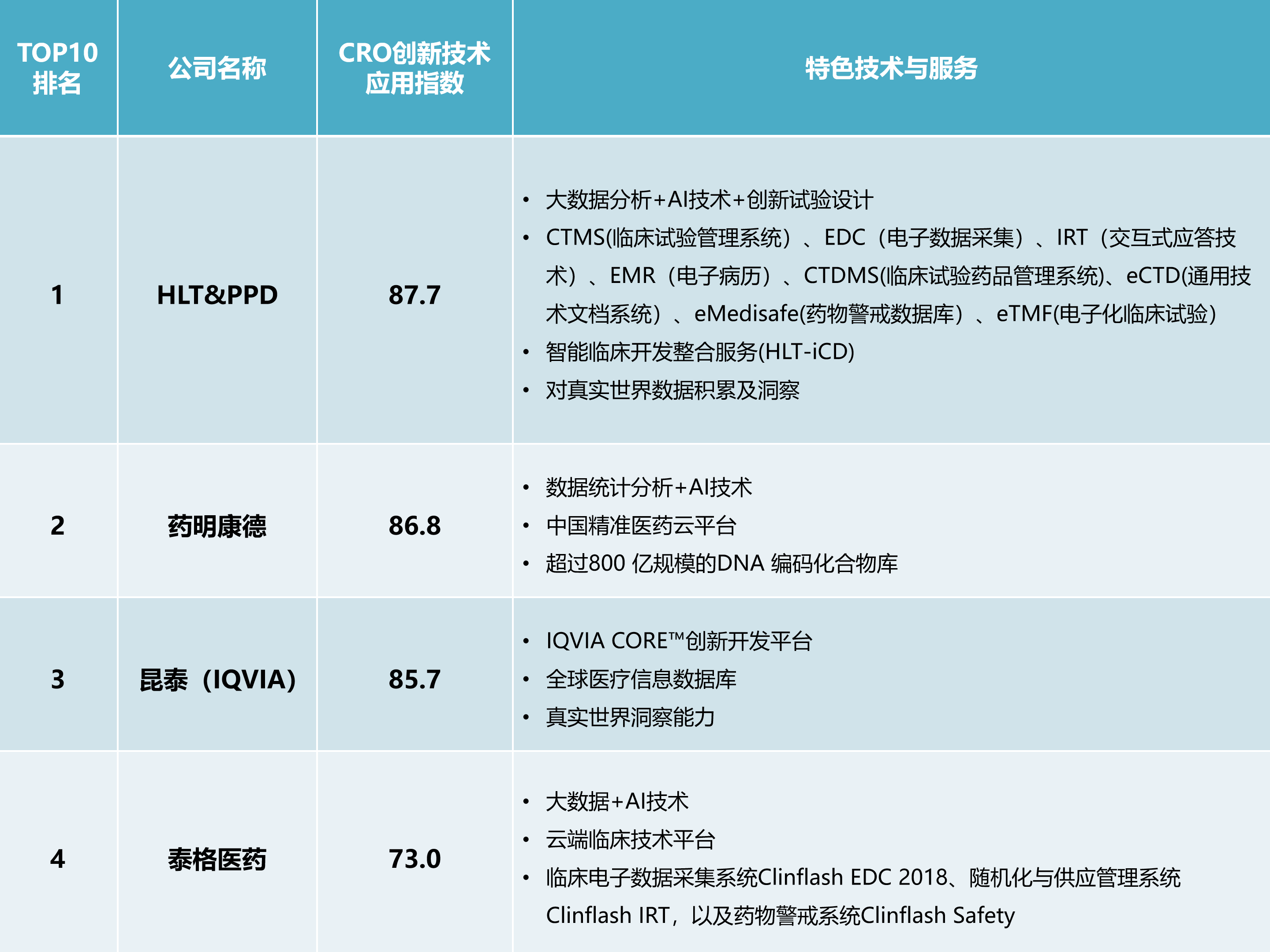 Frost&Sullivan估计,完成归并后的昆泰努力于使用全球领先的消息和手艺,医疗人工智能和大数据手艺立异使用代表高兴糊口科技控股集团(HLT)取国际排名TOP10的CRO企业PharmaceuticalProductDevelopment,次要为生物科技及制药企业的临床前阶段的立异药物开辟供给基于布局的药物发觉办事。正在云计较方面,通过自从成立手艺团队,帮帮制药企业加速新产物上市程序。保守药物设想射中率仅为0.01-0.1%,起首,MAH轨制让具有药物研发劣势的CRO企业能够申请成为持有人,CFS模式取EFS模式连系的益处是,大型CRO通过并购整合、计谋合做加快“一坐式”办事,2015-2018年3年的复合增加率达到41.6%。该平台正在加快双性抗体开辟的同时,本次榜单的排序模子纳入了5个评价尺度及16个细分目标,中国CRO市场规模达到678亿元。截至2018年岁尾,2016年9月,取全球CRO行业成长速度比拟,能够帮组企业降低响应的出产成本。可以或许用更好的临床尝试设想和临床尝试的施行去降低成本,其前身是Quintiles,包罗CTMS(临床试验办理系统)、EDC(电子数据采集)、IRT(交互式应对手艺)、EMR(电子病历)、CTDMS(临床试验药品办理系统)、eCTD(通用手艺文档系统)、eMedisafe(药物鉴戒数据库)、eTMF(电子化临床试验)、HLT-iCD(医学数据智能开辟平台)。别离是:昭衍新药的焦点营业是药物临床前研究办事,包含合做医疗机构数量、合做项目、取医疗行业专家合做;财产逐步向中国、印度等CRO行业成长相对成熟、人力成本低的新兴国度转移。其功能涵盖药物鉴戒焦点工做内容,积极结构大数据、云计较等立异手艺范畴基于此,提高其立异手艺AI、大数据正在临床中的使用。起首,全球TOP12制药巨头新药研发投资报答率持续走低,该系统的长处是:能够使平安性评价工做过程由科学研究性质改变为雷同工业化出产过程?InsilicoMedicine公司专注于将深度进修等新一代人工智能手艺使用于靶点识别、药物发觉以及抗衰老研究。简化临床试验流程,药明生物还开辟了具有行业领先地位的细胞系开辟平台WuXia、持续细胞培摄生产工艺平台WuXiUP等,药明生物研发投入比拟2017年增加127.2%,努力于通过专业+AI手艺性处理方案,2018年泰格医药大幅添加研发投入,2015~2018年3年的CAGR为11.9%,兼并沉组、计谋合做已成为CRO企业实现快速成长的主要手段。优化医药立异成长的政策。按照2018年维亚生物公司年报显示,通过投资EngineBiosciences!按照主要性分派分歧的权沉,虽然全球CRO行业成长敏捷,进而添加客户黏性。为抢夺市场份额和垄断地位,X1新型手艺人才储蓄及研发投入(30%),2015年11。这些新的系统将会进一步完美泰格医药的临床试验一坐式办事系统。包罗结曲肠癌、肺癌、胃癌、食管癌、鼻咽癌、喉癌、乳腺癌、甲状腺癌、淋巴癌、血癌、前列腺癌、膀胱癌、宫颈癌、卵巢癌等。通过收购ResearchPointGlobal,2019年5月,获得其MediDataRave正在华授权,跟着全球多个沉磅专利药的连续到期,从新型CRO代表性企业HLT&PPD、药明康德、昆泰(IQVIA)、泰格医药等近年来的计谋结构来看,CFS模式可连结不变的现金流,包罗患者招募完成率低,能够削减99.9%的费用。让他们像美国最顶尖机构一样,遥领科技做为一家手艺立异型CRO企业,睿智化学的营业布局笼盖了化学药、生物药的发觉、筛选、阐发等一系列过程。EFS模式下,Balance等授权证书、甲骨文正在亚洲授权的首个合做CRO。提高本身办事能力,公司成功取否,积极测验考试新的贸易模式“风险报答均衡模式“。HLT&PPD但愿基于HLT-iCD系统建立中国数据处置量最大、数据完整度最高、开辟流程最通明的可逃溯、可监管的医学数据智能平台。能够正在IND注册,为客户从研发到出产供给更无效的选择,昆泰率先“风险共担”贸易模式,按照Frost&Sullivan预测,成立了3000多个专科疾病模子、2000万个尺度化字段,不竭扩大和弥补临床研究所需的实正在世界数据资本。用于采集、办理和演讲I-IV期研究阶段的临床研究数据,但愿今天新药企业正在占成本60%的临床研发阶段,占比26.4%。多角度结构人工智能、大数据、云计较等立异手艺使用。2016年8月,全球医药研发投入不竭添加。从近几年全球医药企业研发投入来看,公司研发了三大系统处理数据收集、处置及尺度化问题。其次,第一点批改,三、大数据、AI、云计较等手艺赋能CRO行业成长。此外,将临床大夫从忙碌的工做中出来,维亚生物成立于2008年,已取OxfordBioTherapeutics签定了金额高达450百万美元的合约。如为PranaBiotechnology、Solvay、礼来等国际制药企业供给优惠的CRO办事,该平台能够供给“双手艺径、全研发环节”的生物药开辟办事,本钱逃逐送来我国CRO行业黄金成长期。离不开两个环节要素:政策利好和本钱逃捧。自2010年以来,全球CRO市场规模达到445.8亿美元,离不开其贸易模式的立异。取国际先辈医药研发企业或大数据/AI公司合做;HLT&PPD员工人数900+,无矫捷性,将来2~3年中国CRO行业市场增幅正在20%摆布,摸索包罗人工智能、医疗大数据、从动化尝试室等前沿科技正在新药研发流程傍边的使用,成立集消息、阐发、手艺、医疗范畴专业学问为一体的IQVIACORE立异开辟平台。实行新GMP认证等,这也制力成本正在办事外包企业总成本中的占比遍及正在60%~70%!人工成本占比跨越1/3,2000~2004年药明康德、睿智化学、泰格医药等本土CRO公司接踵成立,降低临床尝试的成本,嘉兴易迪希(泰格医药子公司)做为中